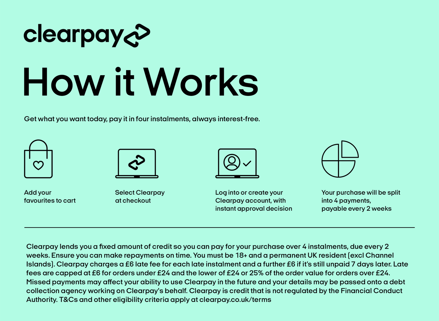 The service is provided by Clearpay Finance Ltd. Clearpay Plans are not regulated by the Financial Conduct Authority.
